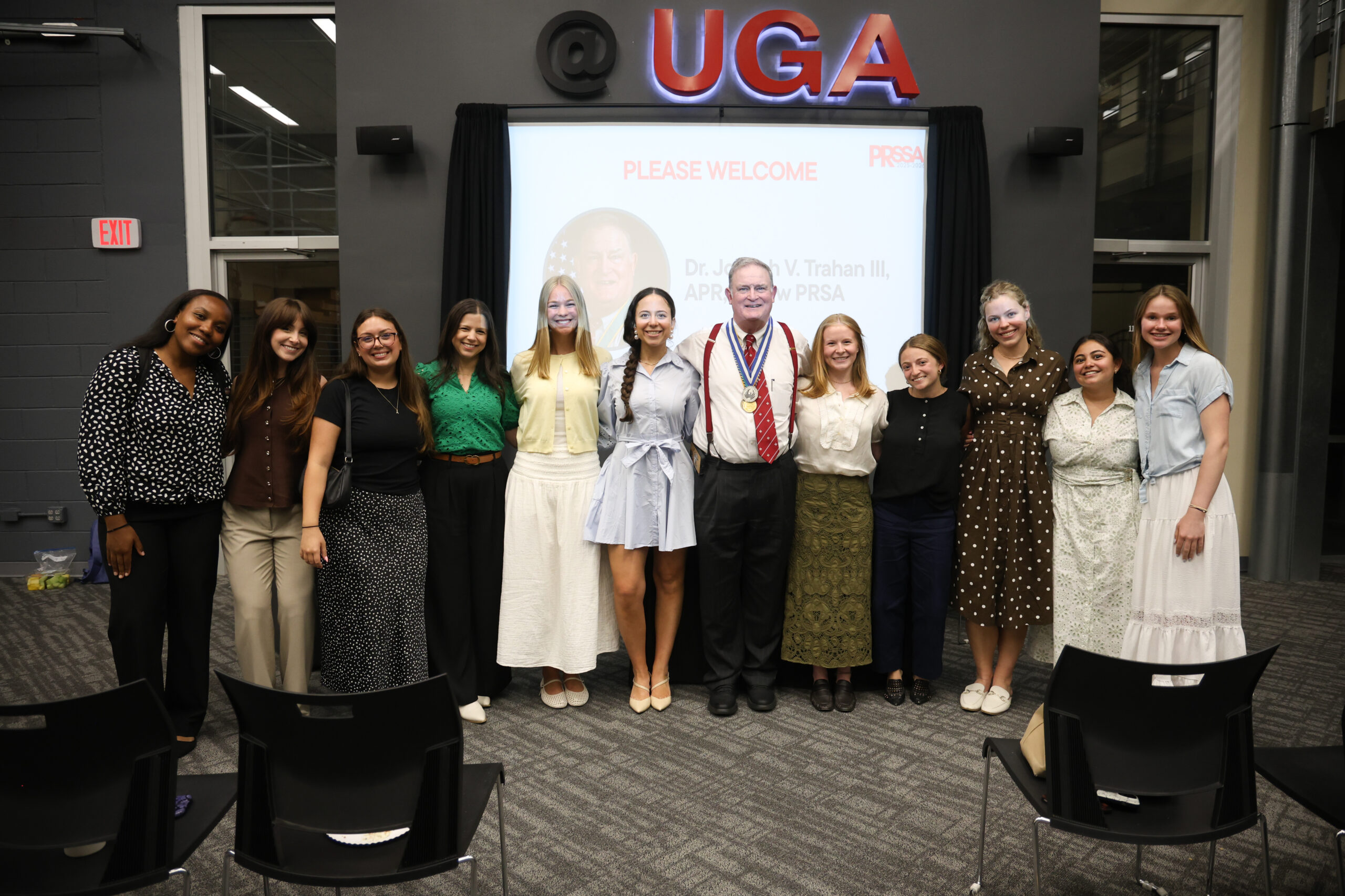 Dr. Joseph V. Trahan, III, APR, Fellow PRSA, and 2025 Order of the Phoenix recipient, was the guest of honor at the UGA PRSSA chapter meeeting on April 7, 2026. Georgia Chapter President Lauren Powers and several members of the Georgia chapter were also present. Sydney Brass, UGA PRSSA chapter president, led the fireside chat Q&A with Dr. Joe.
